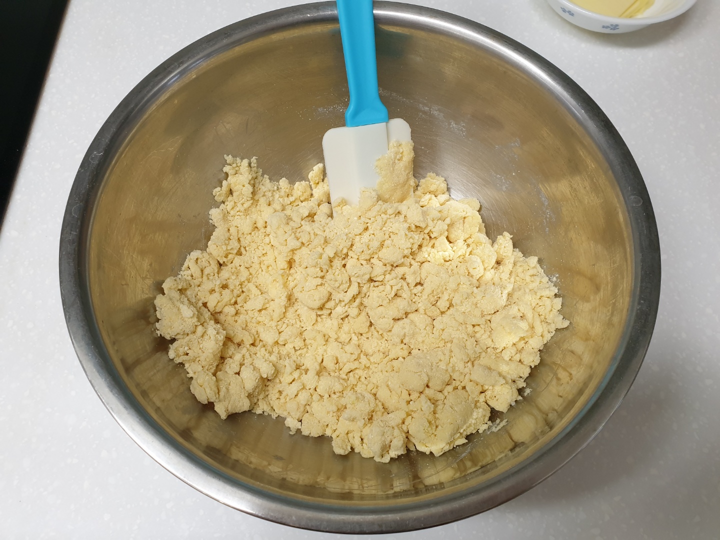 계란은 한알로 잘 사용합니다~개란을 깨서 껍질로 노른자를 분리하고 그중에서도 노른자 반은 따로 간장종지처럼 작은 그릇에 담습니다. 나머지 계란은 모두 가루류에 넣어주세요.간장종지에 넣은 노른자는 나중에 스콘 반죽 위에 발라 노릇노릇하게 색칠할 때 사용합니다.:)