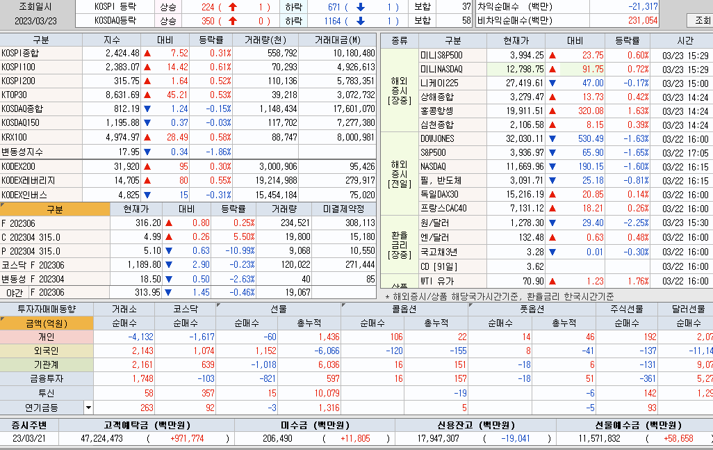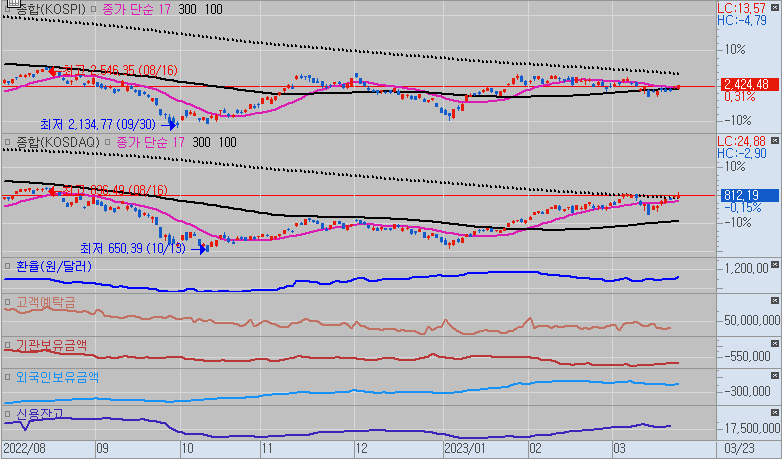 밤새 뉴욕 증시는 연내 금리 인하 없을 것이라는 파월 의장의 발언과 옐런 재무장관의 전액예금보험 거부 등으로 하락했고, 유럽 주요국 증시는 FOMC 결과가 동반 상승하는 가운데 하락했습니다. 이날 코스피지수는 2,398.27(-18.69P, -0.77%)까지 하락하기 시작했다. 장 초반 2,397.91(-19.05P, -0.79%)에서 장중 저점을 형성한 뒤 서서히 하락폭을 줄인 뒤 오전 후반 반등에 성공했다. 이후 안정권에서 등락을 보이던 지수는 장 후반 들어 2,423선을 넘어섰지만 곧 하락세로 전환하며 2,410선 부근까지 밀렸다. 장말 강력한 회복세를 보였던 지수는 장중 최고가 2,424.48(+7.52p, +0.31%)로 마감했다.