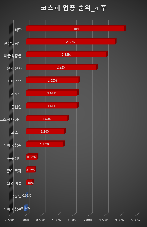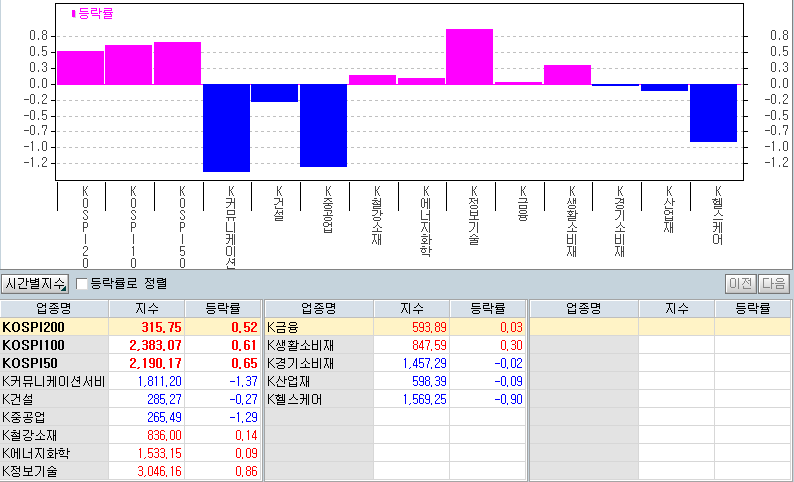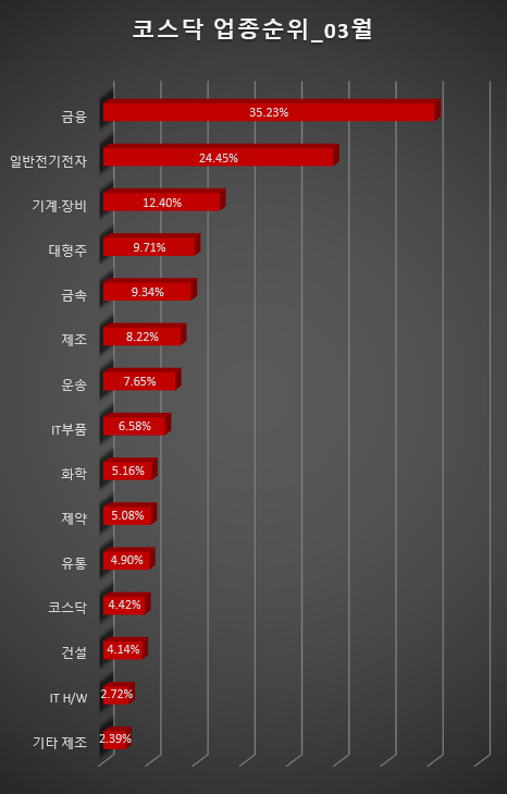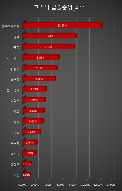 업종별로는 하락 업종이 우세하다. 식음료/담배(-3.92%), 디지털 콘텐츠(-2.78%), 통신 서비스(-2.60%), 기타 서비스(-2.58%), 제약(-2.45%), 유통(-1.77%), 의료 /정밀기기(-1.75%), 통신기기(-1.68%), 컴퓨터서비스(-1.48%), IT S/W&SVC(-1.48%), 섬유/의류(-1.28%), 인터넷(-1.24%) %), 정보기기(-1.15%), 종이/목재(-1.14%), 건설(-1.13%) 등이 하락했다. 반면, 일반 전기 및 전자(+6.62%), 기타 제조(+2.50%), IT 부품(+1.93%), 기계/장비(+1.10%) 부문은 상승했고 화학(+0.72%)은 상승했습니다.