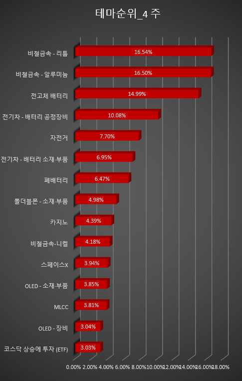 ▷ 이 밖에도 AI 챗봇(ChatGPT 등), 석유화학, 플렉서블 디스플레이, MLCC(Layered Ceramic Capacitors), 온실가스(탄소배출권), 비철금속, 아이폰, 갤럭시 부품 재고, 폴더블폰 등이 높은 성장률을 보였다.